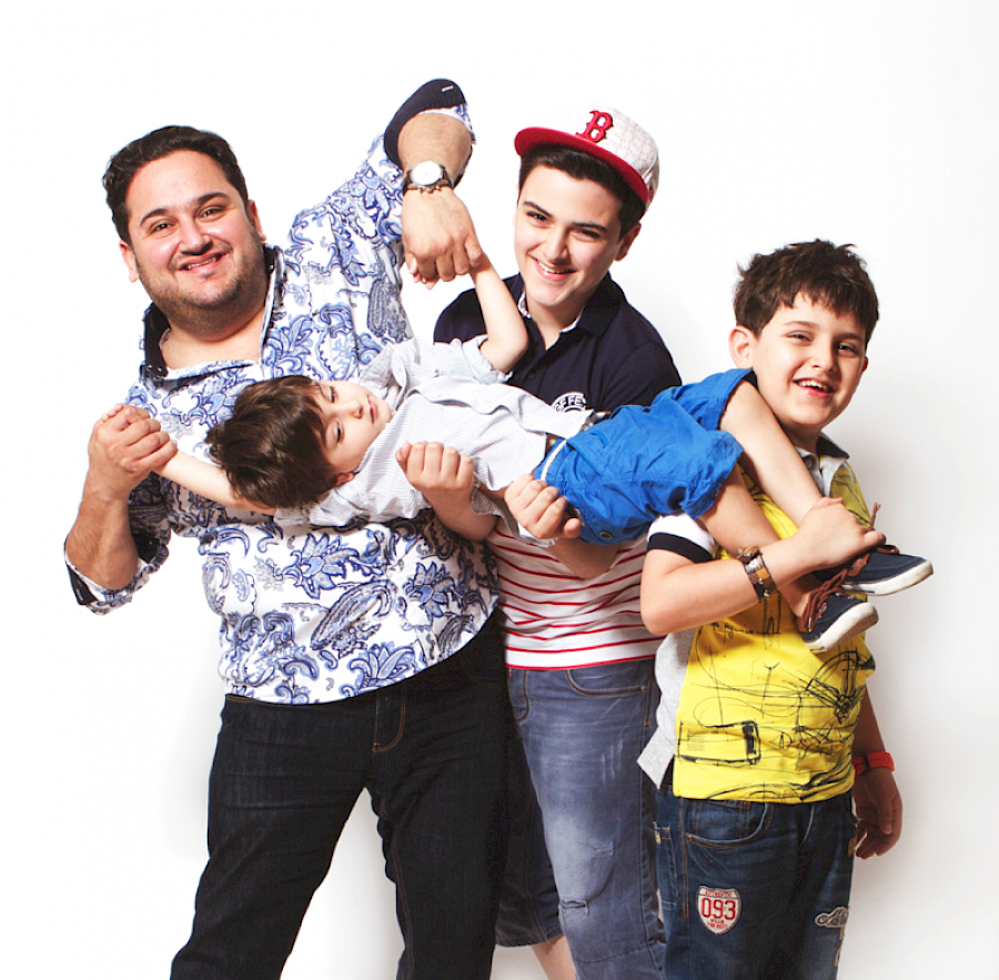 Мурад Дадашов - продюсер, телеведущий. (обувь, часы E. Marinella) Кямал, 12 лет (t-shirt GF Ferre, Али, 9 лет (t-shirt Ferrari), Зия, 3 года (сорочка Fay, шорты Simonetta)