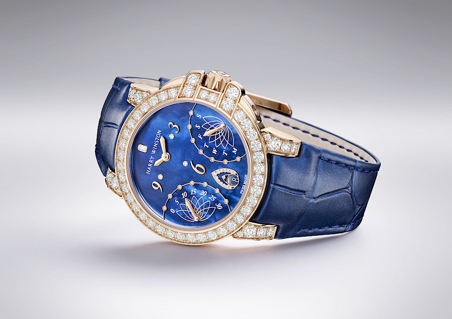 В Базеле компания Harry Winston представил женскую модель Ocean Moon Phase в 36-миллиметровом корпусе из розового золота. Циферблат выполнен из нежно-голубого прозрачного перламутра с декоративной отделкой и бриллиантами, а в центре размещен оригинальный индикатор фаз Луны из розового золота с декоративной решеткой. Модель украшают 163 бриллианта классической огранки, общим весом 3,33 карата. Дополняет романтичный образ ремешок серо-коричневого цвета из блестящей крокодиловой кожи.